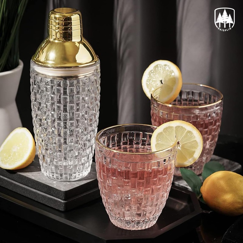- 4 PCS GLASS COCKTAIL SHAKER SET - The best of the basics! This core kit includes the three tools you need to make most common cocktails: a shaker, a 8 inches extra long drink muddler, a classic swizzle spoon with trident fork, and a 15ml/ 30ml two-sided jigger.