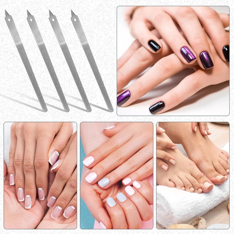 The 4 Pcs Diamond Deb Nail File Set is a must-have for anyone who values precision and durability in their nail care routine. Each file is crafted from high-quality stainless steel with embedded diamond dust, ensuring a smooth and effective filing experience. The sharp pointed tip allows for detailed work, including cleaning under the nails. These files are safe for all nail types, including natural, acrylic, and brittle nails, and come with a protective cover for easy storage and portability. Whether you're a professional cosmetologist or a nail care enthusiast, this set is a versatile and reliable addition to your toolkit. It also makes a thoughtful and practical gift for any occasion.