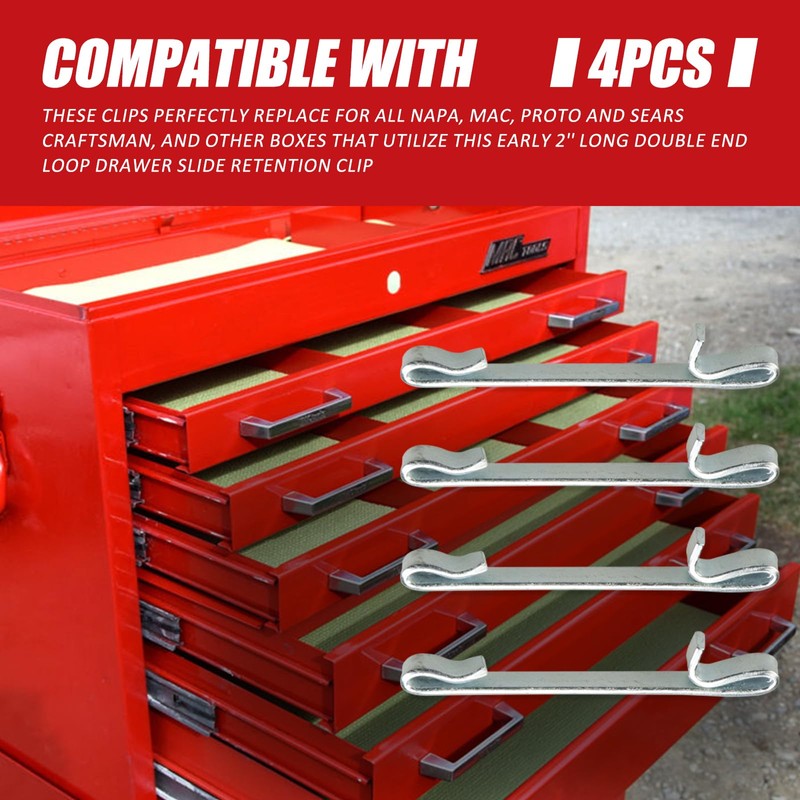 - √【Upgrade Your Toolbox】:These 2" Double Loop Style clips are newly manufactured of heat treated spring steel for all Napa, Mac, Proto and Sears Craftsman, and other boxes that utilize this early 2'' long double end loop drawer slide retention clip.
