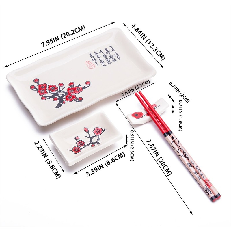 • Size Approx: Sushi Plate: L8" x W5" x H1", Dipping Saucer: L3.5" x W2.5" x H1", Chopsticks: H8"