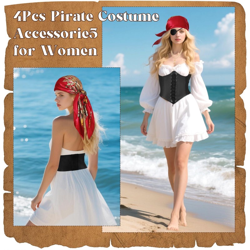 - Pirate Accessories Set: This pirate costume accessories includes 1 satin square print pirate scarves bandana, 1 gold necklace, 1 eye patch, 1 pirate corset. The combination of 4 pcs pirate accessories perfectly captures the essence of authentic pirate attire