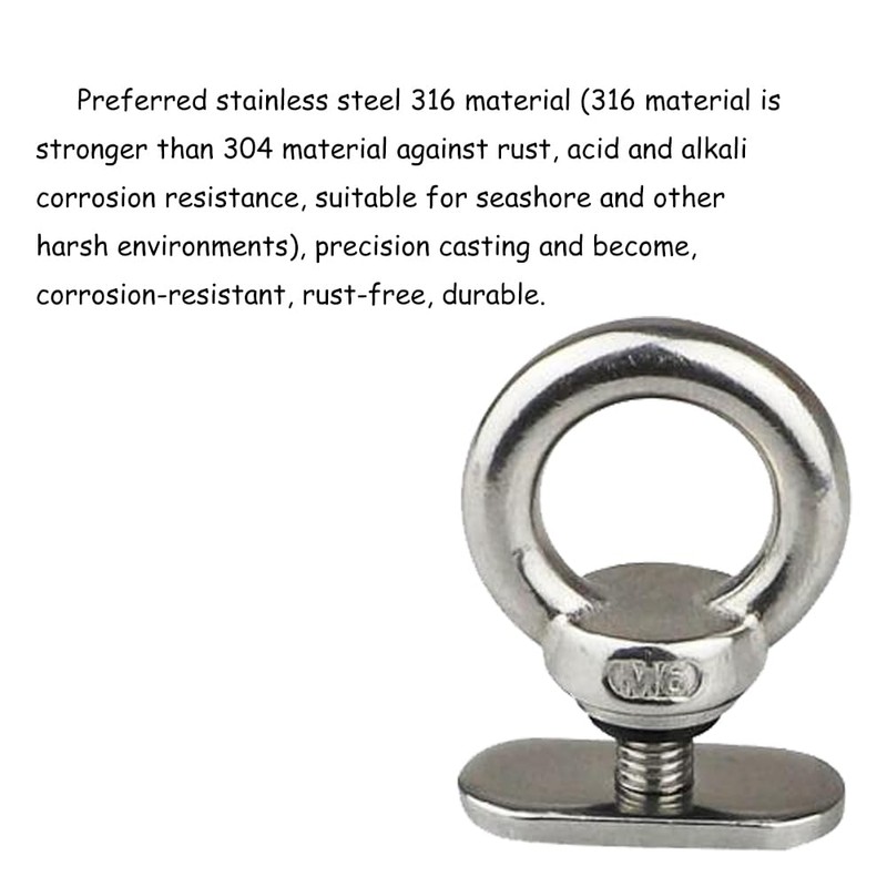 - 【Premium 316 Stainless Steel】 Crafted from top-grade 316 stainless steel, these eye bolt tie-down rings are exceptionally sturdy and durable. Their corrosion-resistant properties make them ideal for use in saltwater environments, ensuring they remain reliable and robust.
