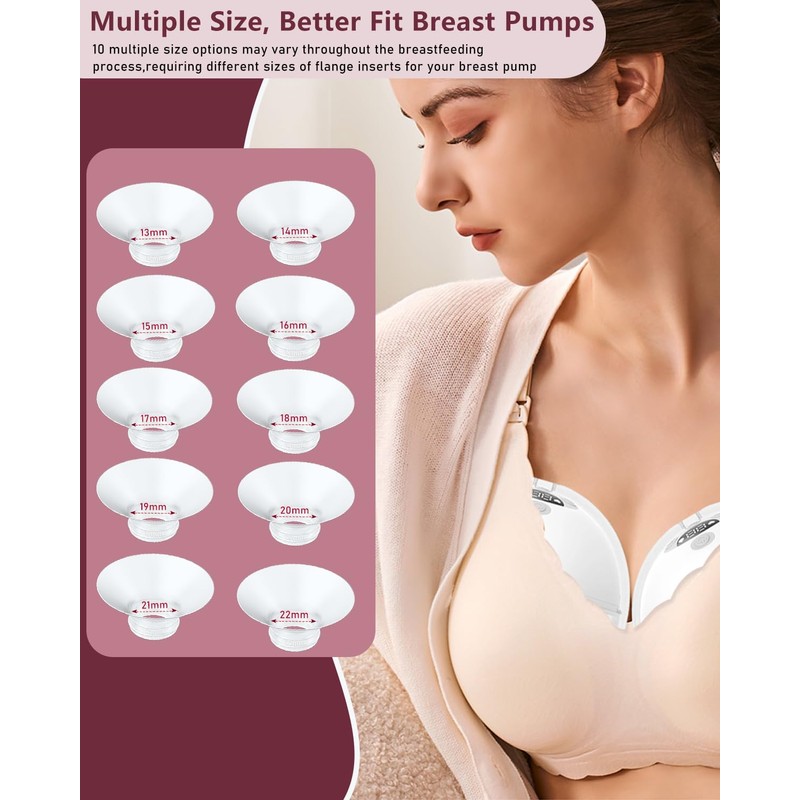 - 【MULTIPLE SIZES BETTER FITTING BREAST PUMPS】:Our flange inserts are available in different sizes:13/14/15/16/17/18/19/20/21/22mm. 10 different size options may vary during breastfeeding and therefore require different sizes of flange inserts for your breast pump.