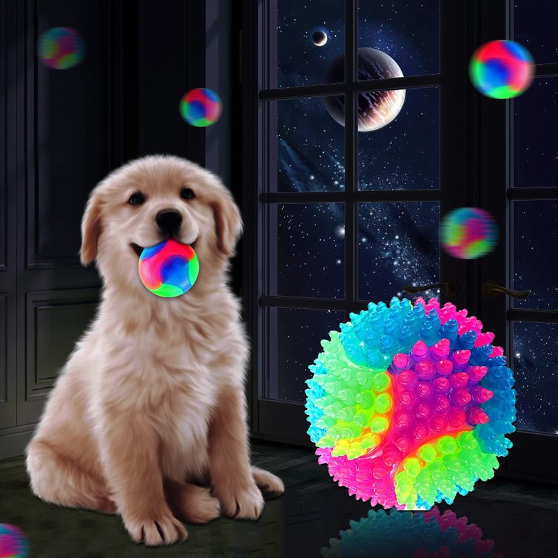 4 Pieces Light Up Dog Balls LED Flashing Spike Pet Balls Squeaky Chew Balls Interactive Dog Toys Glowing Elastic Balls Toss Fetch Toys for Puppy Dogs Cats Teeth Cleaning Chew Toy for Hunting Exercise