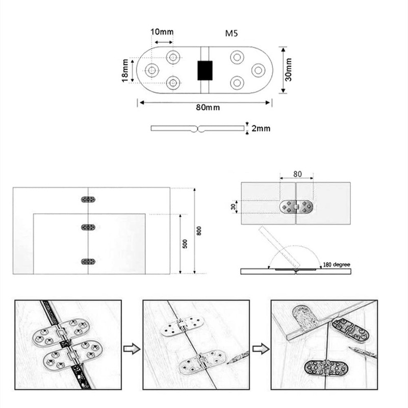 - Material: folding hinges for furniture is made of high quality zinc alloy, the surface is electroplated, wear-resistant and corrosion resistant. The flexible bearing design with 180 degree folding hinge in the middle makes it safer to use