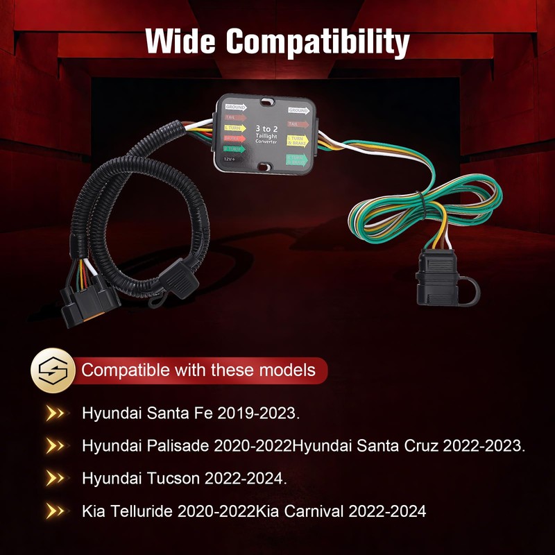 - [Direct Fitment]: 4 Pin Custom Trailer Wiring Harness 56420 Comapatible with Hyundai 2019-2023 Santa Fe, 2020-2022 Palisade, 2022-2024 Santa Cruz, 2022-2024 Tucson, 2020-2022 Kia Telluride, 2022-2024 Carnival, 2021-2023 Sorento