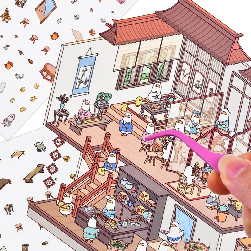 - DIY 3D House Stickers: You will receive 4 sets DIY 3D large size house scene stickers and a tweezer containing 4 different scenes including Mouse bookshop, Dragon Palace treasure, goose teahouse, Temple of wealth, difficulty level up, very fun and creative.