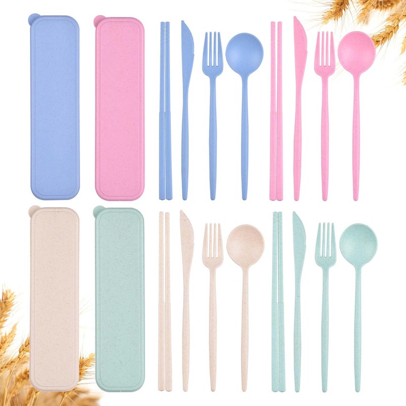 4 Sets Travel Utensils with Case, Reusable Utensils Set with Case, Wheat Stra...
