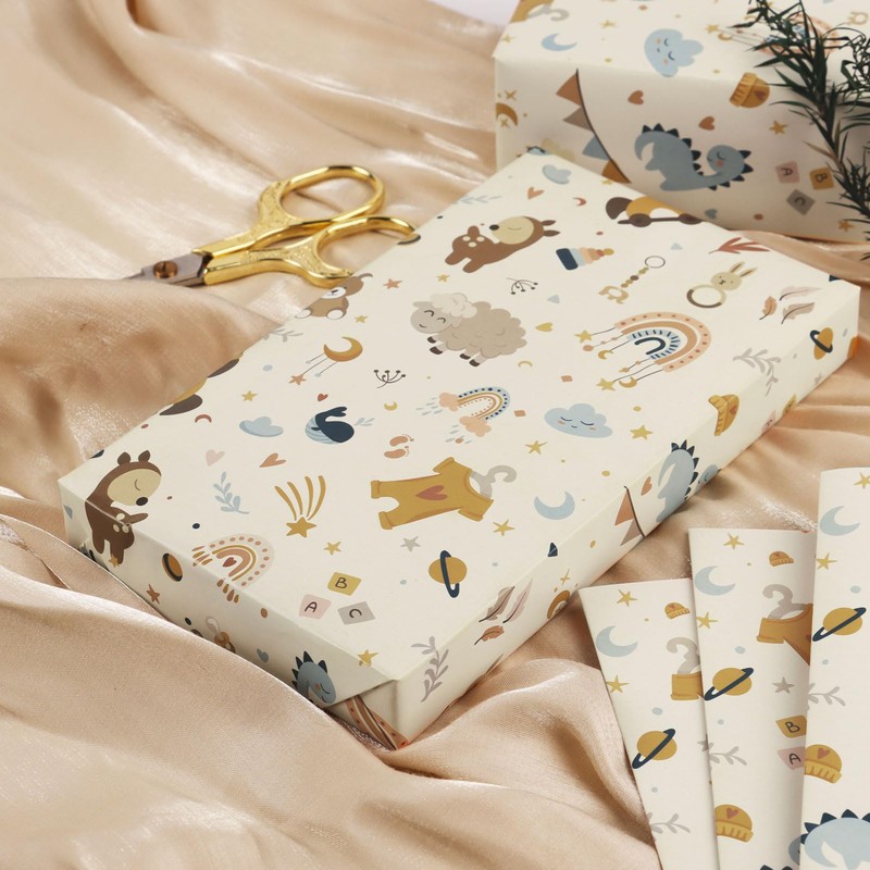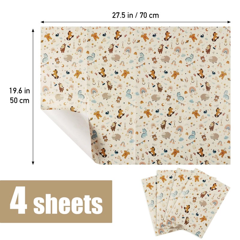 - Contents: you will receive 4 sheets of boho style wrapping paper with wooden horse, rainbow, bear, etc. pattern