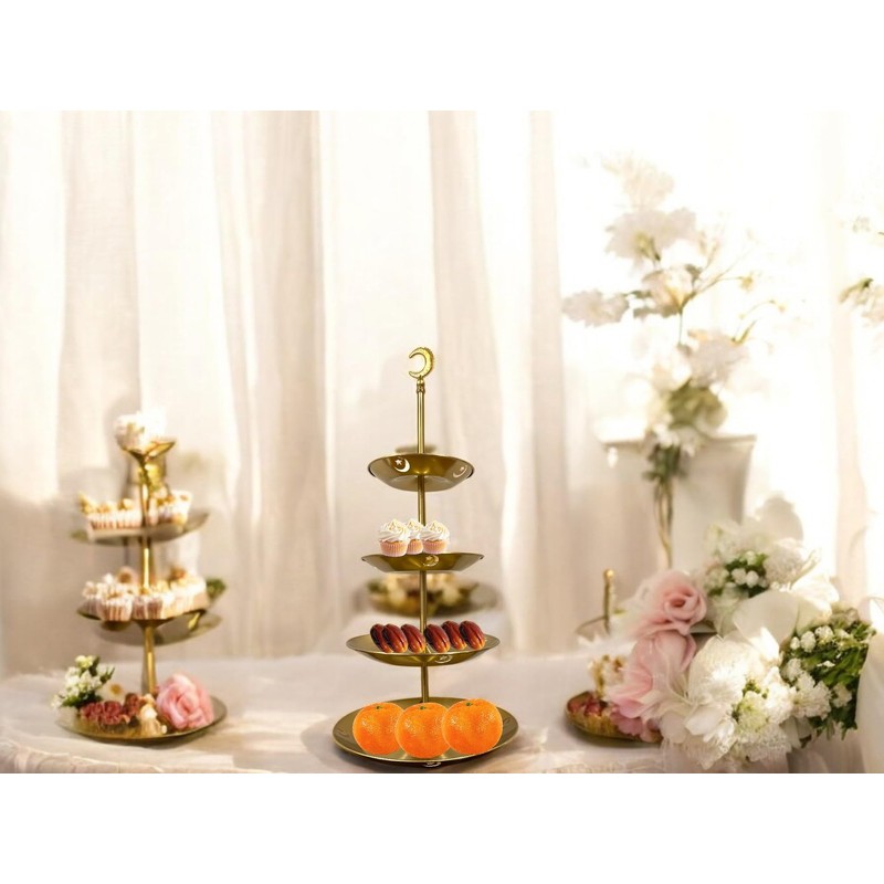 - [Elegant Design] - This 4-tier tray features a luxurious gold finish that adds a touch of opulence to any setting. The standout feature is its crescent moon (hilal) topper, symbolizing elegance and tradition, making it perfect for special occasions, festive décor, or everyday sophistication.