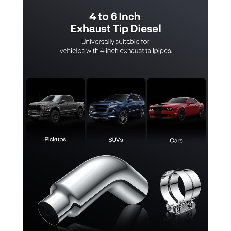 - 【Universal Fit for Trucks, Cars, and Pickups】 Compatible with most standard 4 inch inlet diesel exhaust pipes found on trucks, pickups, and passenger cars. This elbow tip adds a sleek chrome look and functional curve to improve exhaust flow.