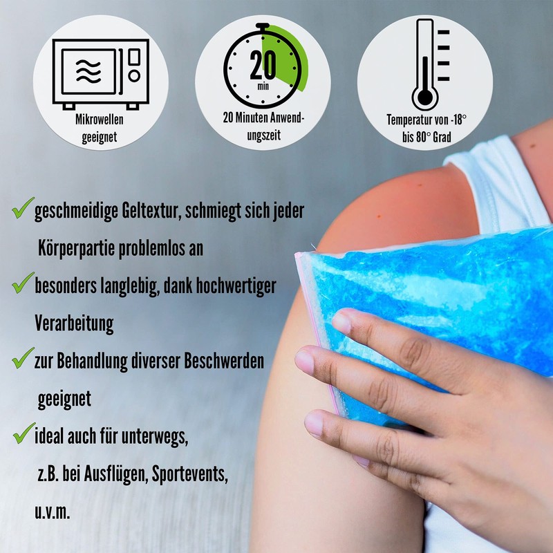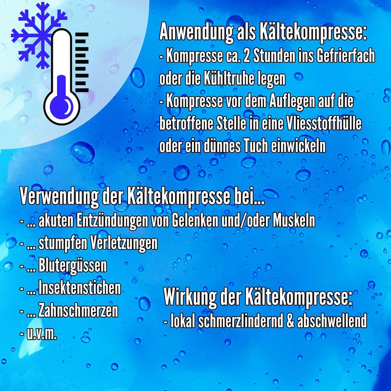 Dressing approx. Place in the freezer for 2 hours - then the dressing can be used. To avoid cold burns, a thin cloth should be placed between the compress and the skin. Sog. Fluid sleeves are available for any size of compresses.