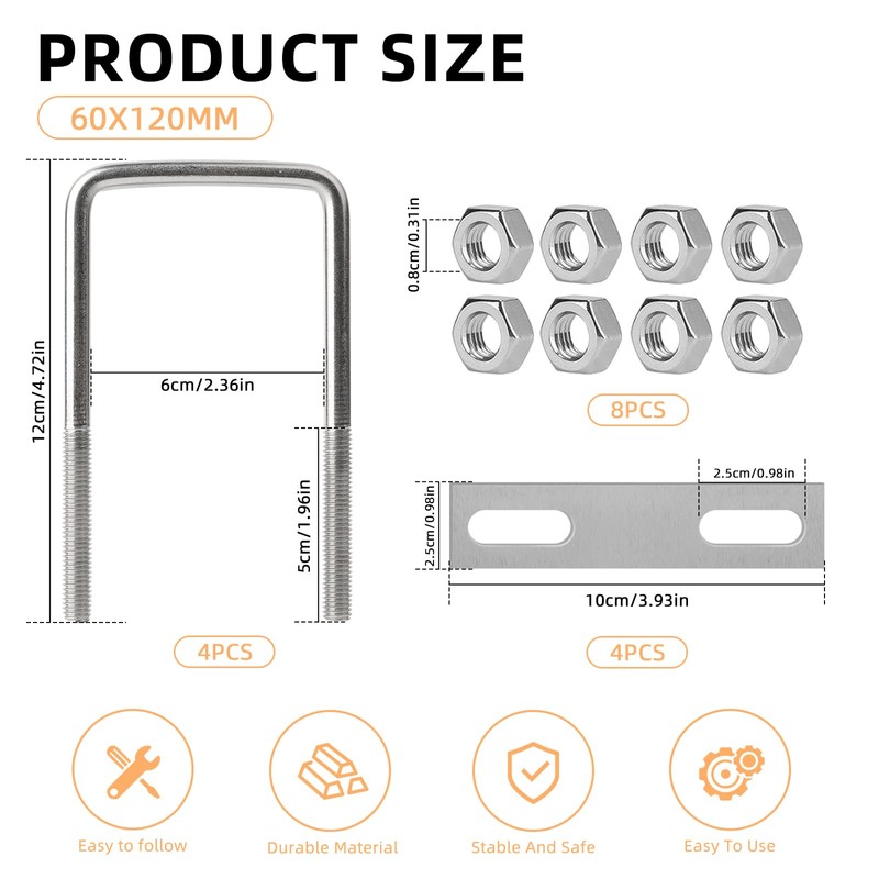 - Size: the total length of the U bracket with counter plate is 120 mm, the inner distance is 60 mm and the bolt tube diameter is 8 mm, a thread length of 50 mm