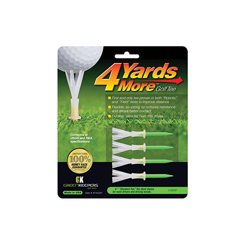 The Green Keepers 4 Yards More golf tee is the first and only tee proven in both robotic and field testing to improve distance. The dynamic 6-prong crown flexes with the force of your drive to reduce resistance at impact and to allow for better contact. The ball launches off the tee with less friction and lower ball spin, resulting in longer, straighter drives. The durable, multi- material construction lasts for over 100 drives. The height gauge allows for consistent tee depth. Conforms to USGA and R&A specifications.