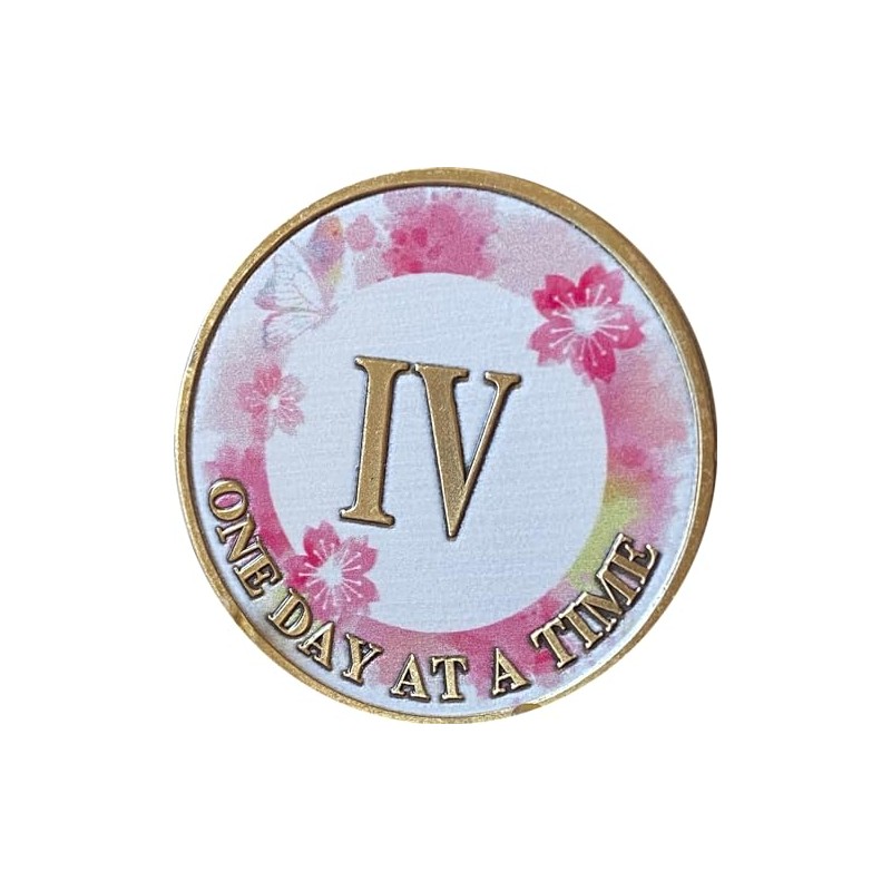 4 Year One Day At A Time Medallion With White Color Background and Pink Flowers and Butterfly Graphics. One Day At A Time On The Bottom and Serenity Prayer On The Back. Coin is a great gift for members of sobriety programs like AA or NA but mentions no program at all. Coin has a year in the center representing a milestone in sobriety or any other life change. Size is 34x2mm or 1 5/16"