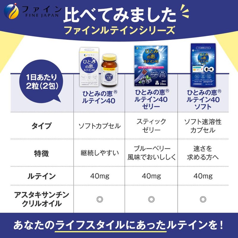 - ひとみの恵Ⓡは、業界最高水準の特濃配合「フリー体ルテイン40mg」、さらにアスタキサンチン、ゼアキサンチン、ビルベリーエキス、ビタミンAなどをプラスして、スマホやパソコンを酷使する現代人の「みる」チカラをサポートします。