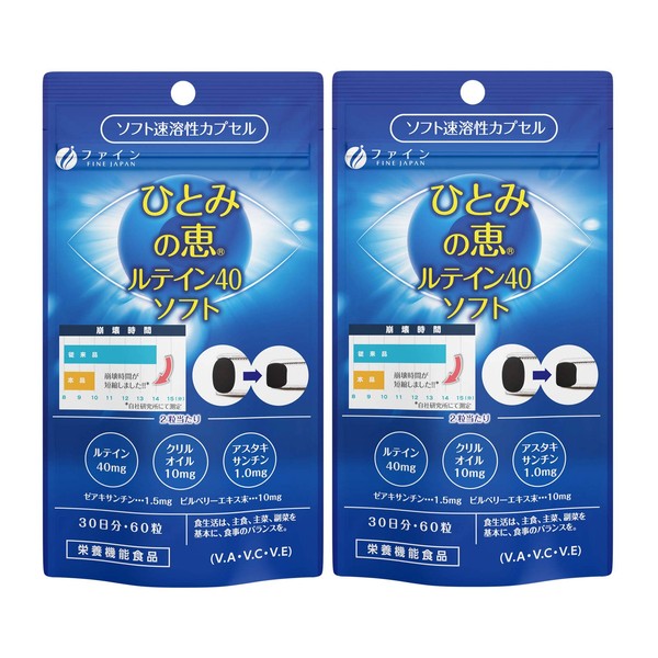 ひとみの恵 スーパーソフトカプセル ルテイン 40㎎ 高吸収型速溶性カプセル ビルベリーエキス末 10mg クリルオイル アスタキサンチン配合 30日分(1日2粒/60粒入) 2個セット