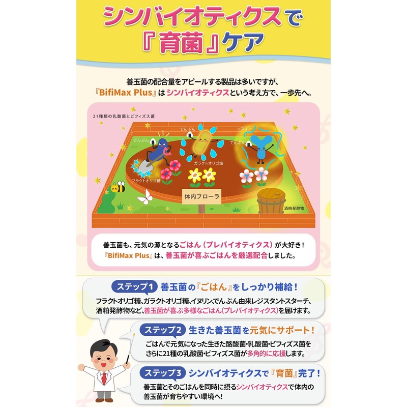 - 【シンバイオティクスでしっかり育菌】 単に菌を補うだけでなく、善玉菌のごはんも同時に摂取し、生きた善玉菌がしっかり働ける環境づくりが重要。BifiMax Plusは、生きた菌の『ごはん』として、フラクトオリゴ糖・ガラクトオリゴ糖・イヌリン、でんぷん由来レジスタントスターチ、酒粕発酵物などのプレバイオティクスを厳選配合し、体内の良好な環境を育むことをサポートします。