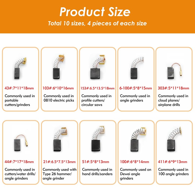 - [PACKAGE INCLUDES]:The product will contain 40 carbon brushes which are used to solve the intermittent problem of power tool and restore the rotating ability of the motor, there are 10 sizes in total, 4 pieces for each size. Specific sizes are as follows: 43#:7*11*18mm,103#:6*10*16mm,153#:6.5*13.5*18mm,6-100#:5*8*15mm,303#:5*11*18mm,44#:7*17*18mm,21#:6.5*7.5*13mm,51#:5*8*13mm. 100#:6*8*14mm,411#:6*9*13mm