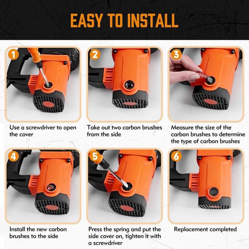 - [EASY INSTALLATION]:Replacing carbon brushes is a quick and easy process. First, use a screwdriver to open the cover of the machine; then, measure to determine the right size of carbon brushes for the motor; finally, install the new carbon brushes into the machine and the replacement is complete