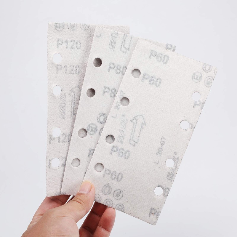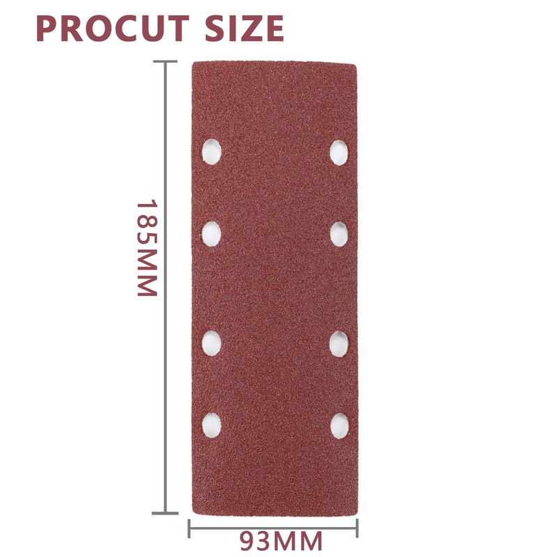 • Size: 93 x 185 mm, pre-punched with 8 holes for dust extraction, suitable for rectangular sanders. Please check if the base plate of the sander matches the size of the sanding pads.