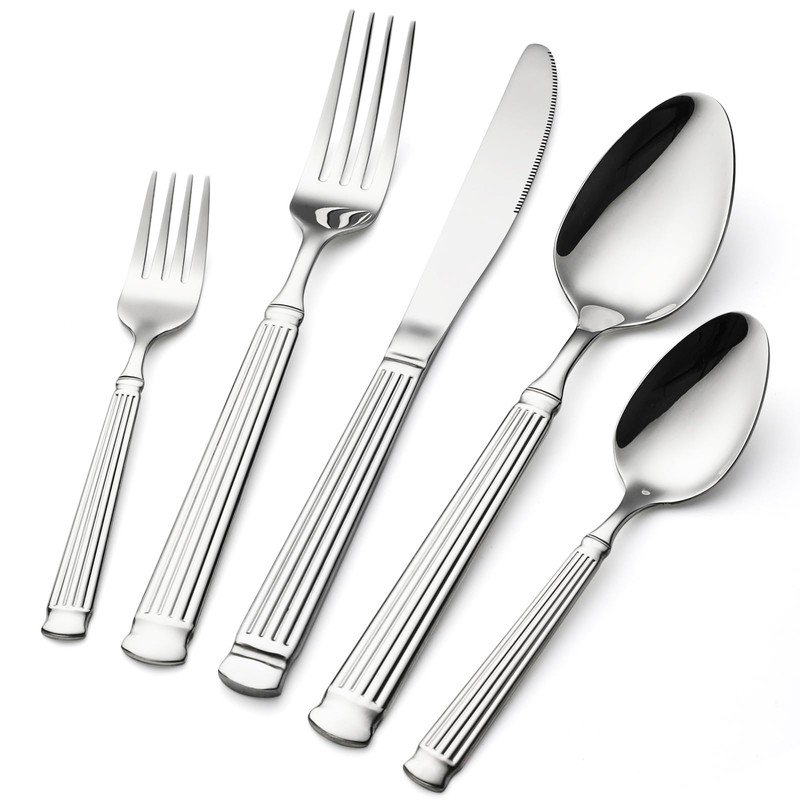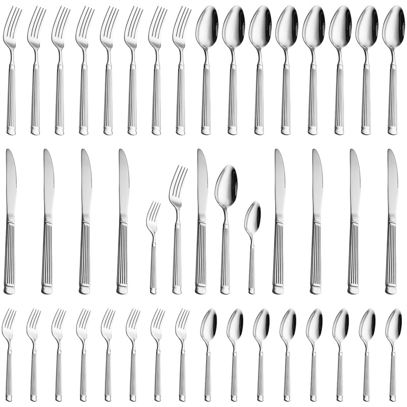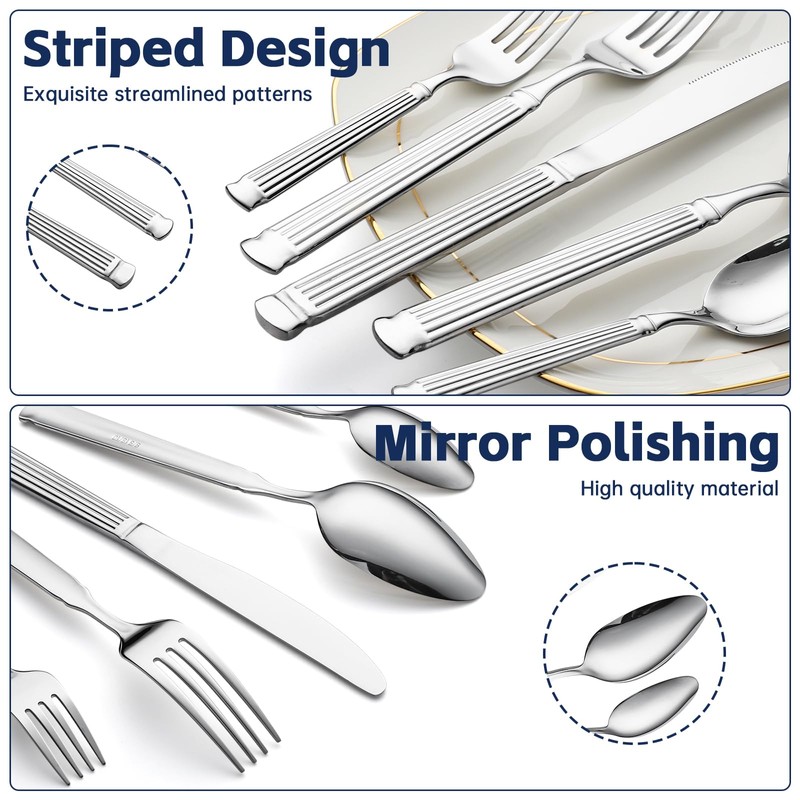 - STYLE: The handles of the cutlery are designed with vertical striped lines and a small recessed arc at the bottom, the overall style is modern and minimalist with a touch of vintage, the elegant silver cutlery can be matched with most styles of napkins, tablecloths or other tableware. A very practical flatware set.