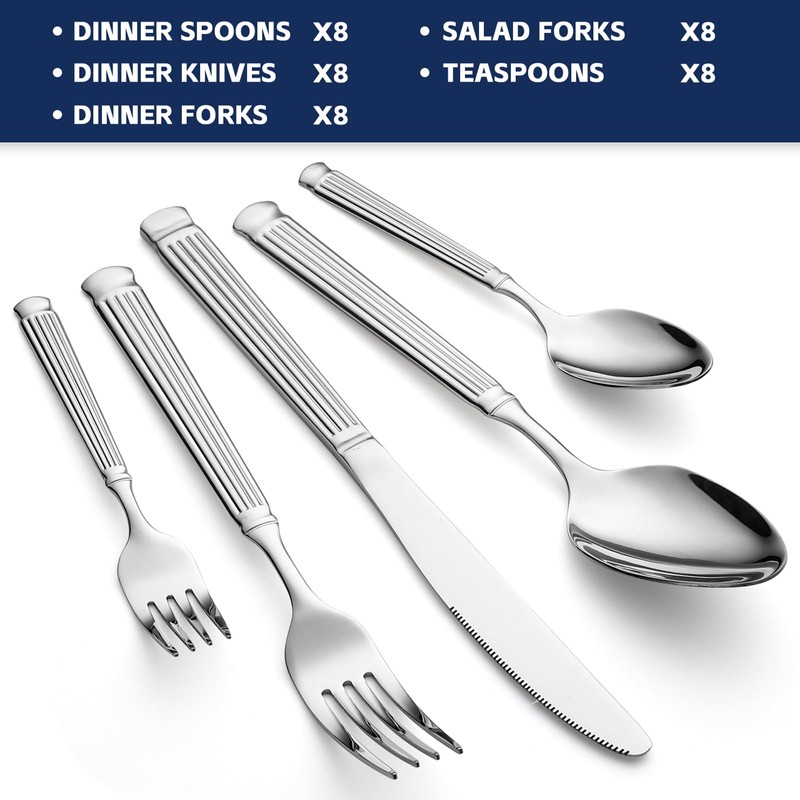 - 40-Piece SILVERWARE SET: The silverware set includes 8 dinner knives, 8 dinner spoons, 8 dinner forks, 8 tea spoons, 8 tea forks, suitable for 8 people. Perfect for daily use at home, or for restaurant, hotel.