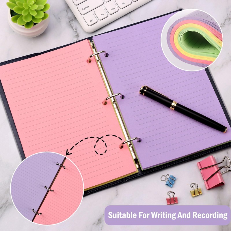 - Fácil de reemplazar el papel y se puede utilizar en muchos lugares: este colorido papel de hojas sueltas es adecuado para una variedad de propósitos, incluyendo notas de estudiantes, registros de oficina, diarios personales, etc. Su tamaño portátil y su diseño de hojas sueltas hacen que sea fácil de insertar o quitar y reemplazar en cualquier momento, por lo que es una opción ideal para estudiar y trabajar. Los estudiantes pueden usarlo para notas de clase y registros de tareas, los trabajadores de oficina pueden usarlo para grabar puntos de encuentro, y también pueden usarlo para dibujo creativo, etc.
