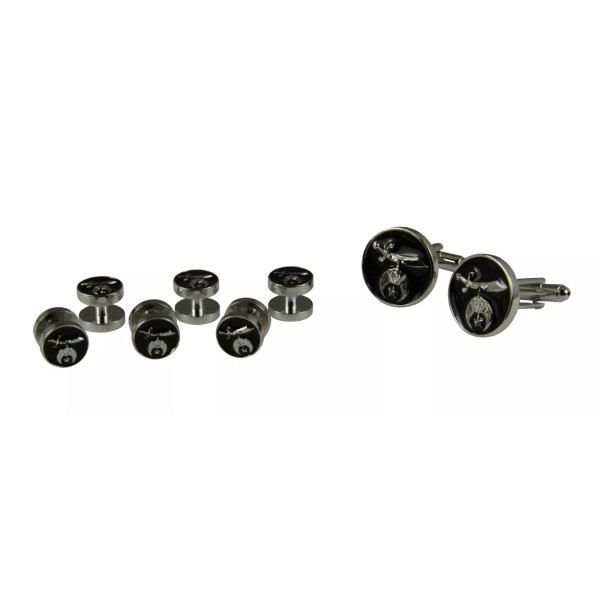This is a beautiful set of 6 Shrine tuxedo or shirt studs finished in a polished silver tone with a black background and a nicely detailed Shrine emblem finished in a polished silver tone. Very nice quality with a detailed Shrine emblem. We also have individual cuff link sets item number 4031920 and tuxedo studs item number 4031921. These will come in a nice box.