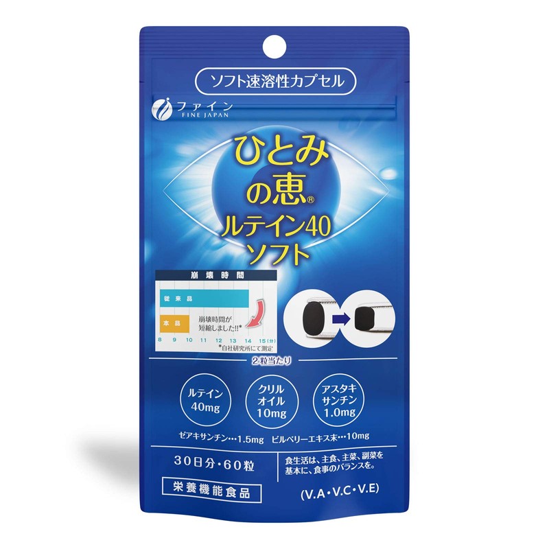 ファイン ひとみの恵 スーパーソフトカプセル ルテイン 40mg ビルベリーエキス末 10mg クリルオイル アスタキサンチン配合 速溶タイプ 国内生産 30日分(1日2粒/60粒入)