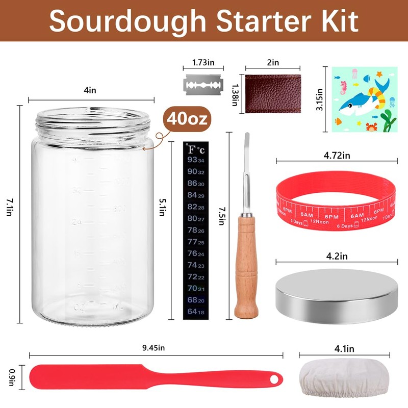 40oz Large Sourdough Starter Jar Glass Kit Wide Mouth with Black Silicone Spatula, Aluminum Lid, Cloth Cover, Date Marked Band, Thermometer (#1p 40oz with Red)