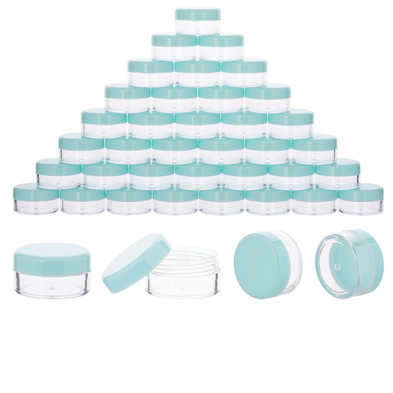 - Plastic Cosmetic Containers:40pcs x 10gram plastic jar containers. 6 Colors: Black lids, Clear lids, Pink lids, Blue lids, White lids, Green lids.