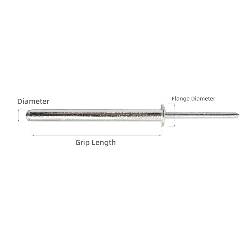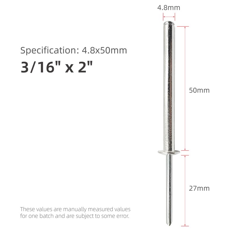 - SIZE & QUANTITY- 40pcs Long Blind Rivets. 3/16"x2"(M4.8x50MM),Grip Length: 2"(50MM) , Flange Diameter: 3/8"(9.5MM), Grip range is 1-29/64" - 1-37/64"(37MM-40MM).