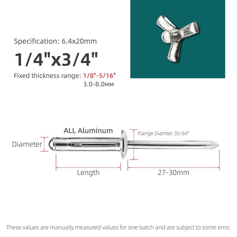 • SIZE & QUANTITY- 40pcs Trifold Rivets.Silver.1/4"x3/4"(6.4x20MM),head of tri grip rivet is about 35/64"(14MM).Fit material size: 17/64"(6.7MM) hole size,Grip range is 1/8"-5/16"(3MM-8MM).