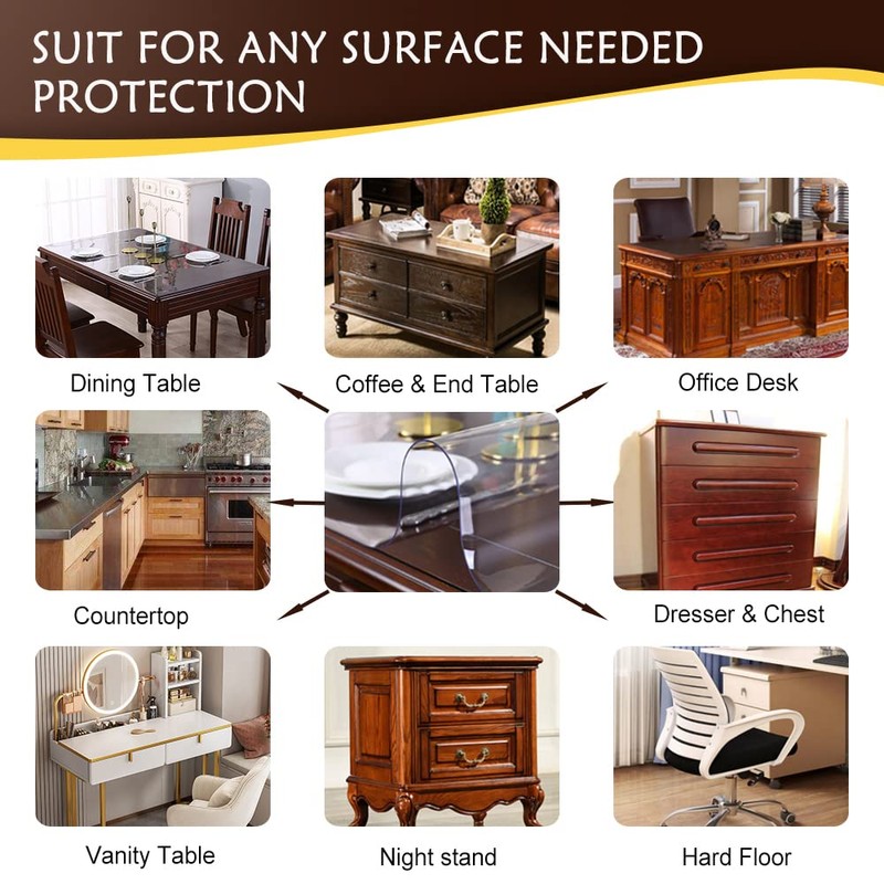 - A.APPLICATION& Eco-friendly BPA-free PVC table pad,furniture top protector,clear plastic vinyl tablecloth cover , use as table runner or placemats top cover mat. To better protect your table, desk, tablecloth and furniture tops against scratches, scuffs, stains, spillage etc. Great for dining table, wooden table, glass, marble, stainless steel top, office desk, writing desktops, coffee & end table, TV bench, dresser and chest table, night stand, countertop, office chair mat, hard floor etc.