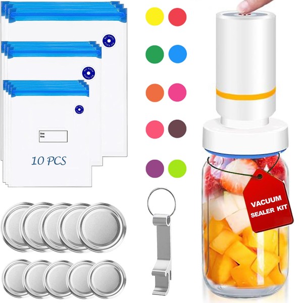 42 PCS Electric Mason Jar Vacuum Sealer Kit, Sous Vide Bags, Handheld Vacuum Sealer and 10 PCS Reusable Vacuum Food Storage Bags, 10 Colorful Lable, 10 Sealing Clips, 10 Lids with lids Opener
