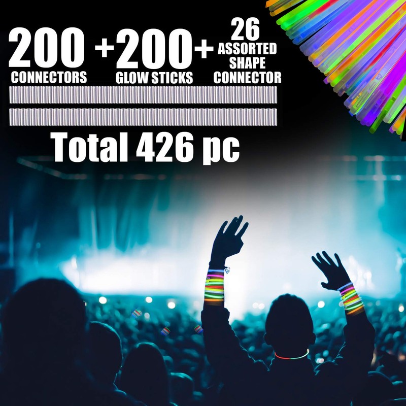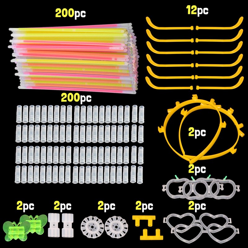 - Mega party package: 200 pieces 8 inch glow sticks, 200 pieces bracelet plugs, 6 pieces glow glasses connector, 2 pieces plugs for multiple bracelets, 2 pieces butterfly plugs, 12 pieces glasses plugs, 2 piece headband piece, 2 piece flower connector
