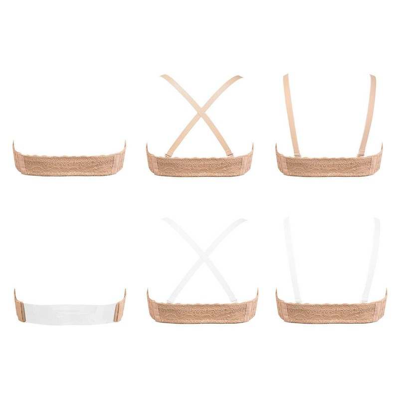 - Convertible bra comes with 1 bra, 2 color shoulder straps, 2 clear shoulder straps, 1 color back band and 1 clear back strap. So it converts 6 ways for versatility-- strapless traditional crisscross halter backless and one shoulder for strapless dress, low cut tops, backless dresses, low back t-shirt, and everyday's wear.