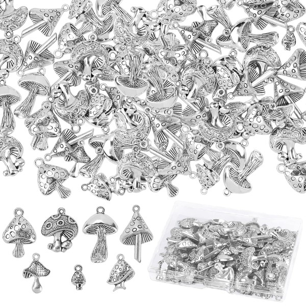 42PCS Mushroom Charm, UHOMENY Mushroom Charms Pendants Beads for Jewelry Making Antique Silver Mushroom Charms Craft Jewelry Findings for DIY Necklace Bracelet Crafting with Box, 7Styles