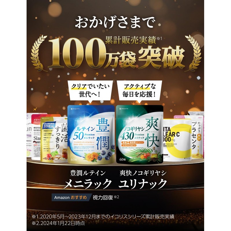 ノコギリヤシサプリメント「爽快ユリナック ノコギリヤシ430」は、ノコギリヤシオイルをしっかり430mg(2粒あたり)配合。 トイレが気になってゆっくりできない。気分がスッキリできない。長時間の外出や運転が不安。そんなあなたの体を本気でケアする配合量です。 さらにユリナックは、スッキリをサポートするだけじゃありません。もっともっとこれからも、今まで以上にアクティブで居たいあなたを応援するノコギリヤシサプリメントです。 最近、なんだかボンヤリしてしまっていませんか?会話にキレがないと感じていませんか?脳や網膜などの神経系に豊富に含まれるDHA・EPAも配合しました。 アクティブに動けていますか?坂や階段が前よりも苦手になっていませんか?軟骨成分のグルコサミンとプロテオグリカンが立つ、座るをスムーズにする助けをします。 日々の生活はもちろん、仕事も趣味も家族サービスももっともっとアクティブに積極的になって欲しい。そんな思いを込めた、ノコギリヤシサプリメントです。