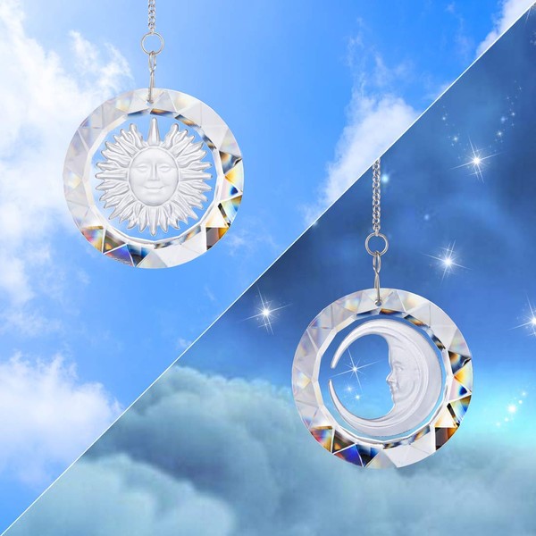 - 🌞🌛Show Details: The crystal prism suncatcher that will reflect pretty light under the illumination of sun,it has two type half moon and sun,they decor you home.It was 2 pack.
