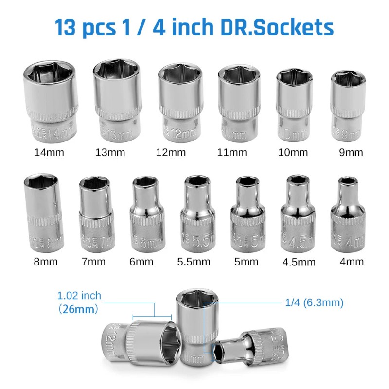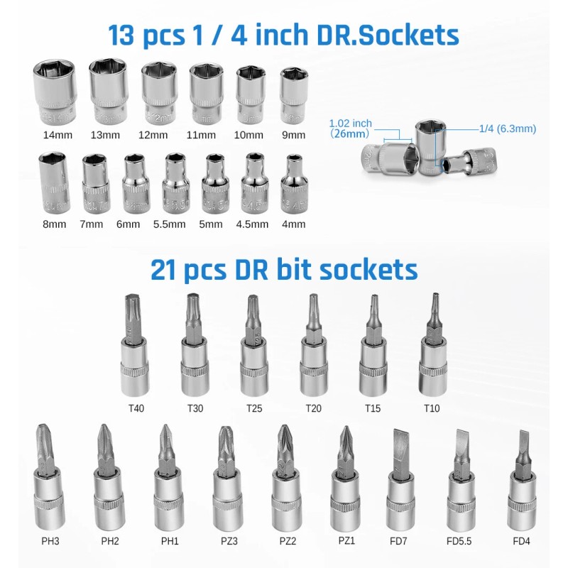 Packing List:1. Bit Sockts Set---21pcsPhilips Screw: 4 5.5 7Meter shaped: 123Ten screw:123Six screw:345678Multi shaped:T10T15T20 T25T30T402. Hex key spanner [1.5/22/5mm]----3pcs3. 1/4" Short bits holder [50mm]---1pc4. 1/4" Long bits holder [100mm]---1pc5. 1/4" Socket Sliding T Bar [110mm]--1pc6. 1/4" Extension bar [140mm]--1pc7. 1/4" 72T Ratchet Wrench----------1pc8. 1/4" Spinner Handle [140mm]---1pc9. 1/4" AD Universal Bits Holder---1pc10. 1/4" Universal joint---1pc11. 1/4" Mertic sockets--13pcSize: 27.5x20x5.8cm N.W.: 1.42kg