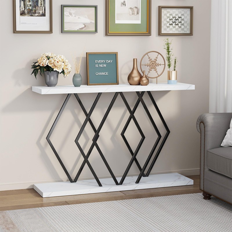 - Elegant Modern Console Table: The combination of tabletop and base with faux marble white finished veneer and 3 pieces of geometric gold metal frame creates modern aesthetics and a stunning glamorous visual effect. You can set this contemporary console table in your living room to show you a unique taste, or in the hallway to add a posh touch