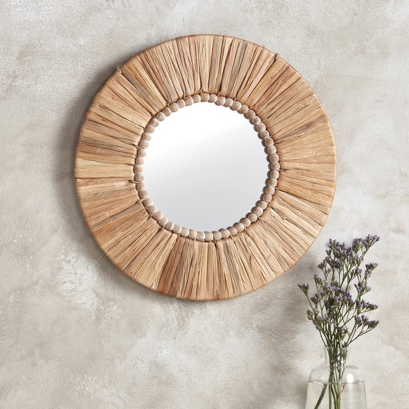 47th & Main Boho Beaded Round Wood Wall Mirror, 31-Inch Diameter, Water Hyacinth