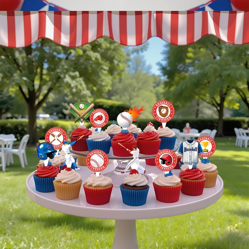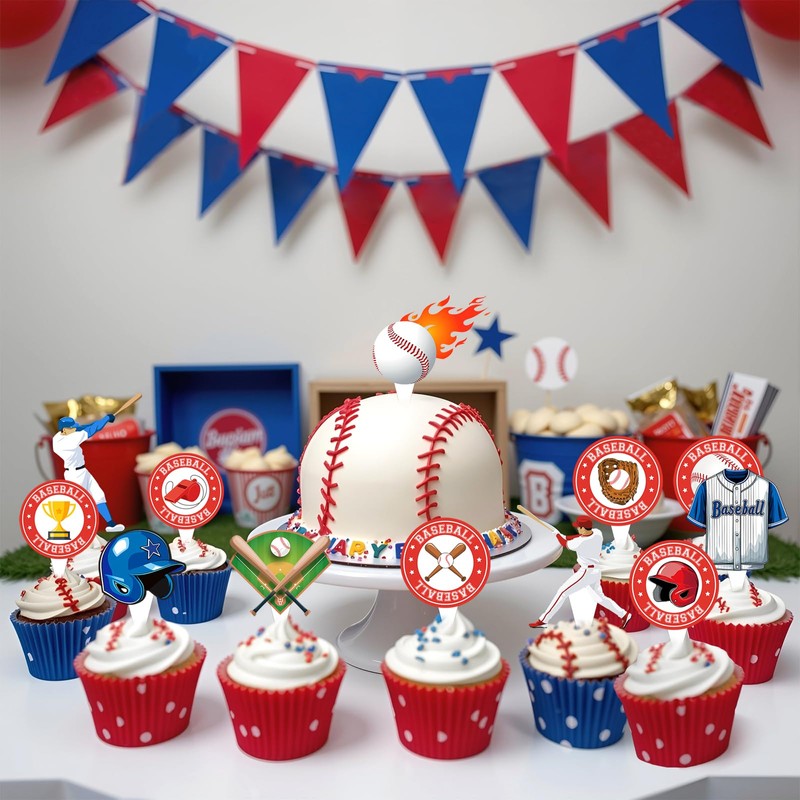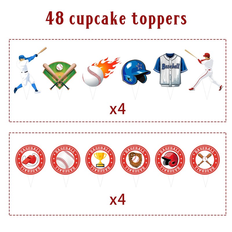 - Baseball Cupcake Topper Design: The baseball birthday decorations feature many baseball pattern elements and use classic colors like blue, red, and white. The baseball themed party decorations will create an interesting and unforgettable baseball birthday party.