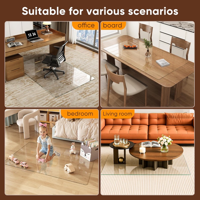 - Crystal Clear & Scratch-Resistant Surface:The ultra-transparent glass showcases your beautiful flooring (hardwood, tile, or carpet) without hiding its natural texture. The scratch-proof surface stays pristine even with daily use, resisting scuffs and marks.Low-profile transparent mat blends seamlessly with any decor while providing a smooth rolling surface; easy to clean from food residue, crayons, and daily wear