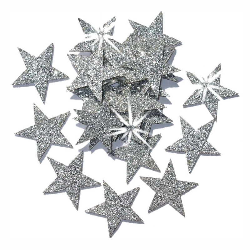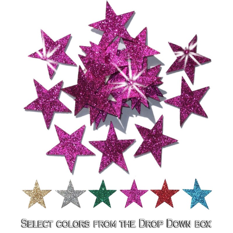 1 pack in the selected colour. Iron-on patches. 2.5 cm glitter stars: approx. 25 mm in diameter. 1 pack = 24 iron-on stars.
