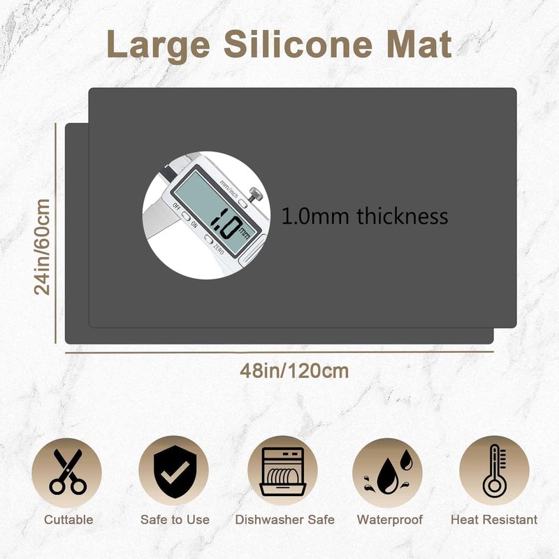 - 【Premium Silicone Material】Sized at 48" x 24"(120cmx60cm), the kitchen counter mat is made of premium silicone, no odor, reusable, not easy to deform and tear, you can be cut to the desired size to fit countertops of different sizes and shapes, effectively protcet your table from stains.