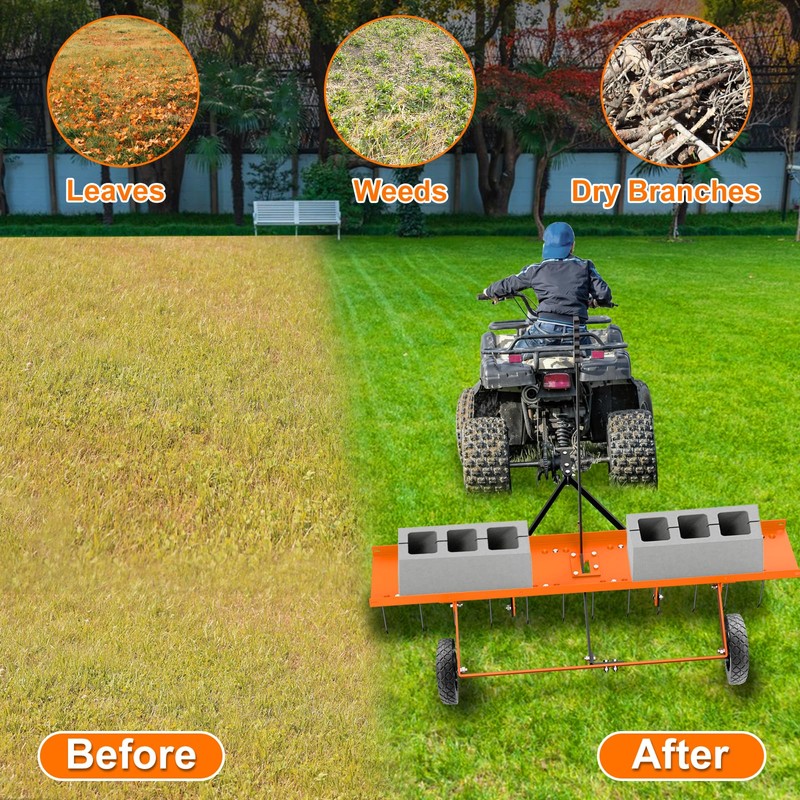 【Durable】Tolpassa lawn rake is ruggedly constructed with high-quality carbon steel for durability. It features 24 steel teeth to prevent warping and wear. With it, you can enjoy years of reliable service without ever needing another lawn rake. Say goodbye to worries about weeds, and take care of everything with ease. 【Efficient Debris Removal】Equipped with two rows of curved, spring steel tines, this pull behind dethatcher covers a 48-inch wide mowing area, making it easy to remove thatch, hard-packed soil, twigs and dry leaves. The tray holds up to 70 lbs and the heavy-duty wheels provide additional support, increasing efficiency and greatly reducing the effort required for manual raking. NOTE: Remove all residue from steel teeth after each use. 【Adjustable Height】The adjustable handle allows you to raise or lower the tines as needed. Raising the tines protects them from damage when navigating over hard surfaces, while lowering them helps aerate the soil for improved root growth. This method also effectively disrupts weed growth, helping your lawn or crops flourish. 【Versatile Compatibility】The lawn mower attachment's heavy-duty universal connector allows for easy attachment to various mowers, tractors, or ATV, UTV. It adapts to different hitch heights, ensuring efficient and flexible leveling of garden patios, lawns, farm. 【Easy Installation】Spring and fall are the best seasons for raking, weed removal, and lawn repair. Choose our tow behind dethatcher for a hassle-free experience! We provide all the necessary accessories, and our installation guide on the homepage will walk you through each step. If you have any questions, feel free to contact us; we’ll respond to Amazon emails within 24 hours. 【NOTE】Depending on the raking effect you need, add weight appropriately to ensure the desired effect.Before you buy that lawn rake cart, double-check that there’s a good spot at the back of your vehicle to attach it. Safety first, make sure to be careful while putting it together and using it to avoid any scrapes or injuries.