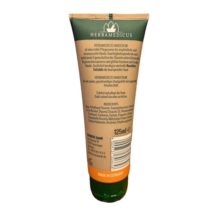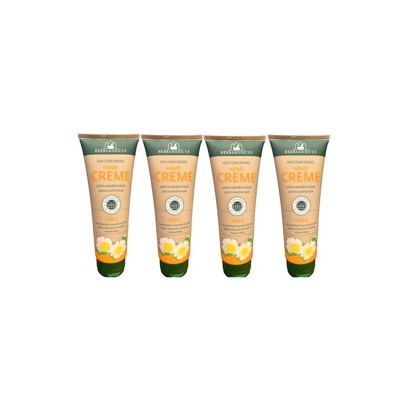- Herbamedicus Handcreme Kamille für empfindliche und beanspruchte Hände feuchtigkeitsspendend und schützende Eigenschaften des Glycerin unterstützen de Regenerationsprozess und glätten trockene und rissige Hände